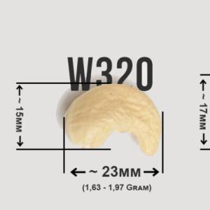 Cashew nut w320 grade (or: white whole cashew 320, cashew w320, cashew nuts ww320, white whole cashew w320, cashew grade w320, cashew kernels w320, W320 cashew size) – high quality, regular-size, non-damaged and non-split and white, popular whole cashew that would produce between 300 – 320 pieces per pound (453.59g) – (about 660 – 706 pieces per kg) and is known internationally as Standard Large Nuts. They have a nutty flavor and a rich taste to be USED in recipes of salted cashew nuts, honey cashews, whole-grain salt-roasted cashews, chili garlic cashews, wasabi cashews …or to be processed by salting, sugaring, flavoring, roasting, oil frying or industrial processing into cashew cheese or cashew butter …